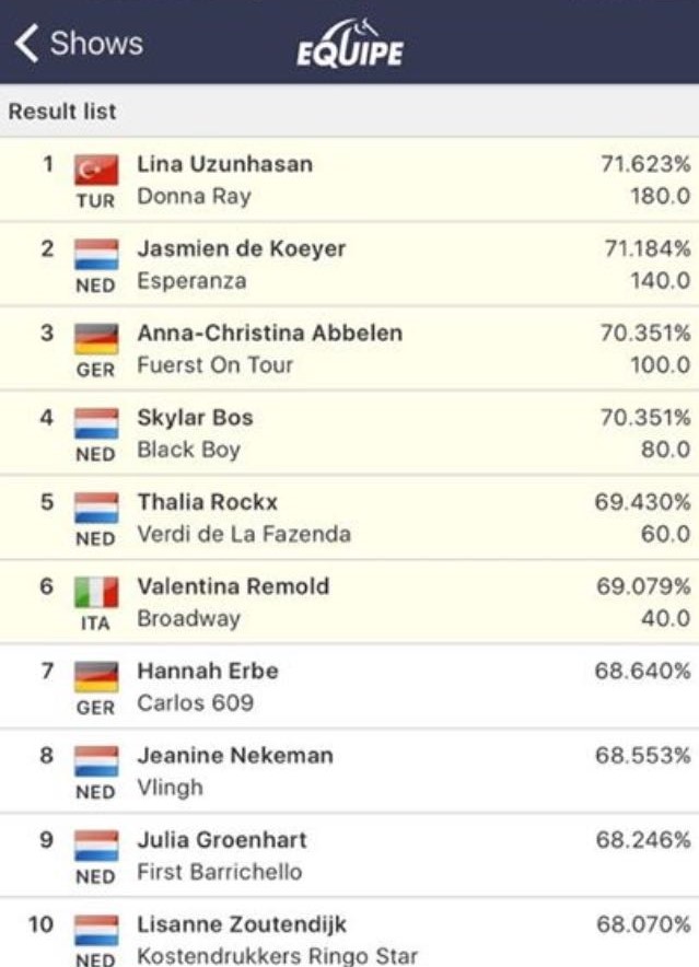 1 – 4 Aralık 2016 tarihleri arasında Hollanda Roosendaal’da düzenlenen CDI yarışmaları kapsamında ilk defa Genç Yetişkin kategorisinde yarışan Milli At Terbiyesi sporcumuz Lina Uzunhasan ve Donna Ray isimli atı Young Rider Team test yarışmasında birinci oldu.